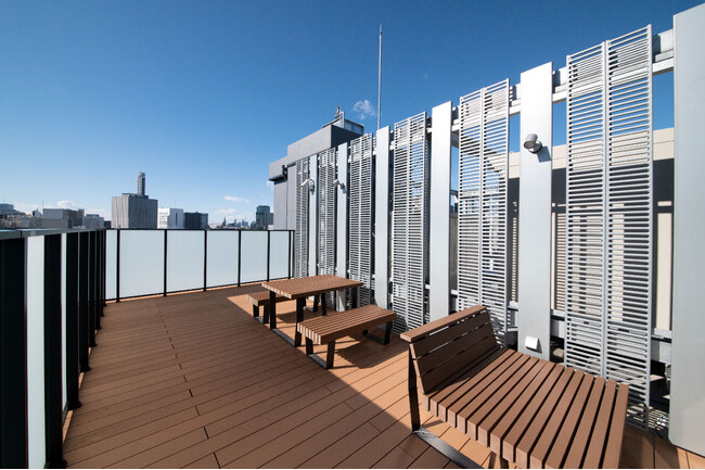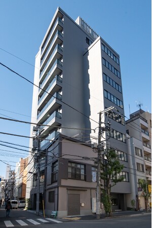 本物件は、地上11階建てのオフィス・住居(SOHO)ビルです。エントランスの右横に店舗を設け、コーヒー・アイスクリームショップが出店し、オフィスワーカーの憩いの場となっています。そしてソファのある広々としたエントランスホールが来訪者を迎えます。エレベーターは2基備えられ 、2階~9階のオフィスフロア用と10階・11階の住居(SOHO)用の各専用エレベーターとなっています。屋上にはテラスがあり、リフレッシュスペースとして利用することができます。