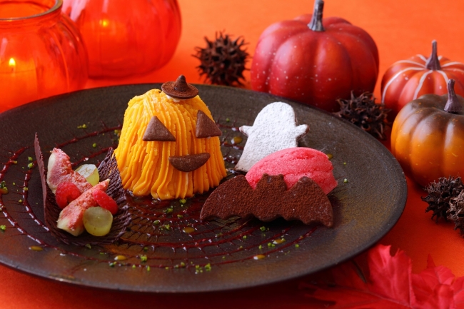 「ラウンジ」で販売する『おばけかぼちゃのモンブラン』はスポンジの上に細かくカットされた2種の栗が入ったペーストをのせ、甘さ控えめのかぼちゃクリームをしぼりココアクッキーでおばけかぼちゃをデザイン。おばけやこうもりのクッキーとハロウィンらしくクモの巣をイメージしたカシスのソースやシャーベットをトッピングしました。SNS映えするフォトジェニックなデザートプレートです。