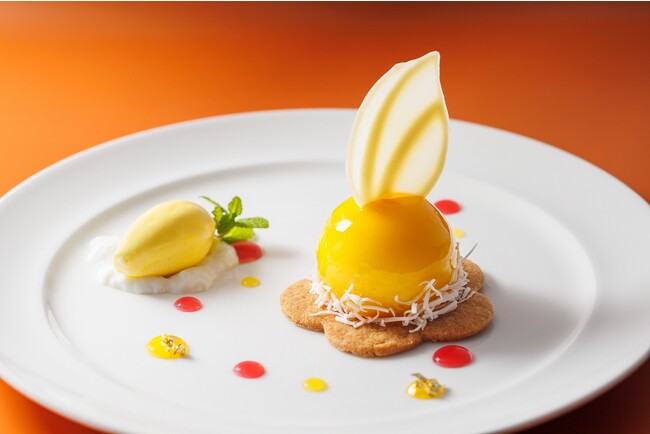 トロピカルな味わいのマンゴーコンフィチュールを包み込んだ、マンゴー風味の軽やかなクレームダンジュ。仕上げにマンゴー味チョコレートのグラサージュ・ブランで美しくコーティングし、さらに爽やかなマンゴーソルベを添えた、まさに宮崎産マンゴー尽くしの贅沢な一品です。香り高いアールグレイのサブレをアクセントに、お祝いのデザートにふさわしく華やかに仕立てました。