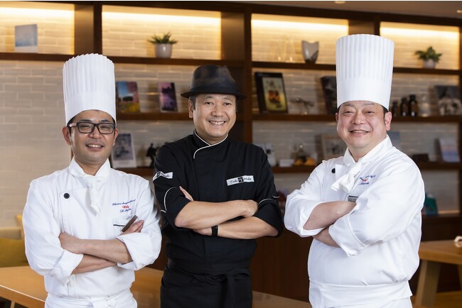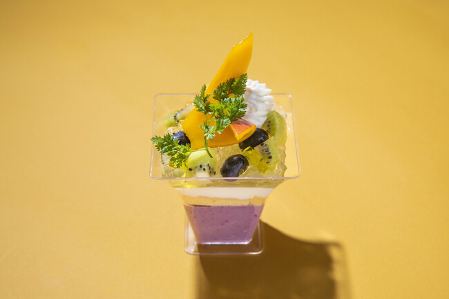鎧塚シェフと、シェラトン・グランデ・オーシャンリゾートのエグゼクティブ シェフ・パティシエ日吉、製菓・製パン料理長の藤田が試作を重ね、完成した宮崎県産マンゴーのミニパフェ3種。イートインはもちろん、テイクアウトも可能です。