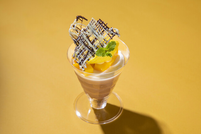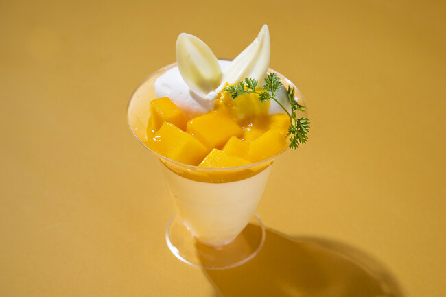 マンゴーのパンナコッタ、マンゴージュレの層の上に、宮崎県産マンゴーがゴロっと乗った、マンゴー尽くしのシンプルで贅沢なパフェ。濃厚なマンゴーの風味が口いっぱいに広がります。