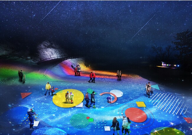 今回は「Happy Stars」をテーマとし、無数の星々が輝く星空の下に広がる雪原に、映像を通して宇宙の惑星や星々がポップに舞い踊り、色鮮やかなライティングと共に街中では決して見ることができない光景を演出いたします。