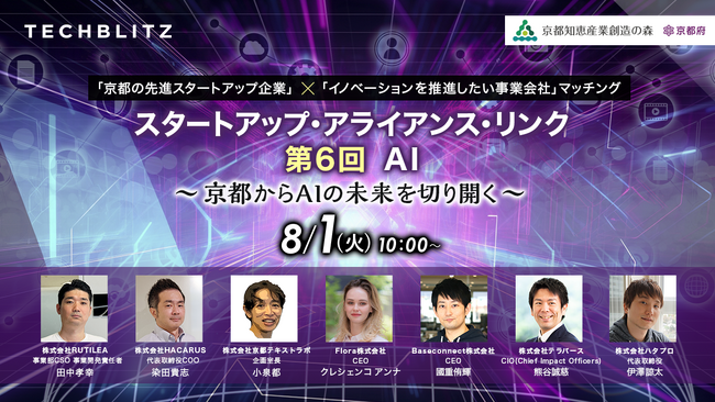 イシン株式会社(本社:東京都新宿区 代表取締役社長:片岡 聡)は、「一般社団法人 京都知恵産業創造の森」「京都府」と共に8月1日(火)にピッチイベントを開催します。AI分野の京都発スタートアップ企業7社が登壇し、将来のビジネスパートナーに向けてプレゼンテーションを行います。