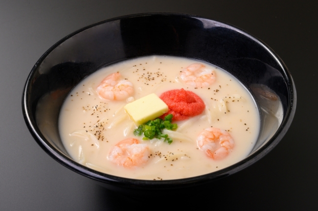 バターとクリームの香りの良い濃厚な出汁のうどんにぷりっとした海老と明太子をトッピングした冷えた体が温まる冬季限定のメニューです。