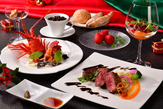 ホテルガーデンのイルミネーションやセンターグリルの炎の演出を眺めながら、松阪牛や伊勢海老、尾鷲産キンキなどの三重県産高級食材をふんだんに使用した3種類のコースからお選びいただけます。また、小学生のお子さまにもクリスマスオードブルからメインの子牛のローストまで全7品のクリスマスキッズコースが登場し、ご家族皆さまでクリスマスディナーをお楽しみいただけます。