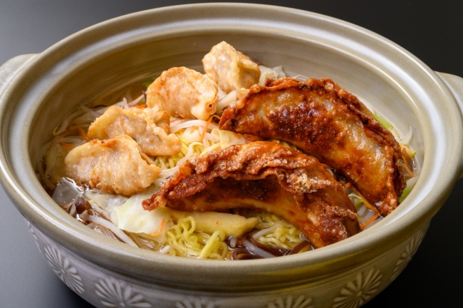 熱々に熱した土鍋の塩ラーメンに野菜をたっぷりのせ、普通のサイズの餃子とジャンボサイズの餃子をトッピングした豪快な冬限定のラーメンです。