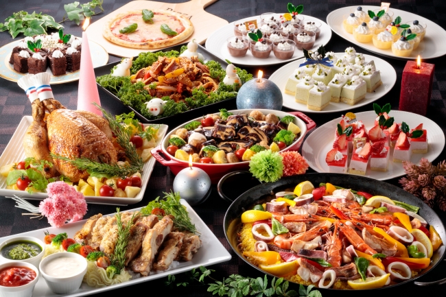 12月1日(日)よりクリスマスフェアを開催します。ランチでは甘味のある冬野菜を使用したチーズフォンデュグラタン、ディナーではローストチキンや魚介のパエリアなどのメニューをはじめ、牛肉の赤ワイン煮込みなど、クリスマスにぴったりの華やかなメニューをご用意しております。デザートには苺とホワイトチョコのケーキなど、色とりどりのケーキでクリスマスをお楽しみいただけます。