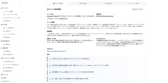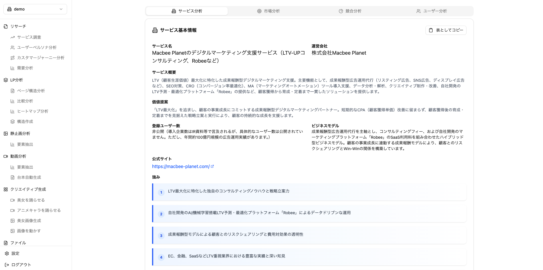 「Research Pro」は、会社名とサービス名をもとに、サービスの強みや競合、利用ユーザーの属性を調査・分析し、新規提案や案件稼働時の理解を深める用途で活用できるように設計しています。さらに、その調査結果をもとに、エビデンスにもとづくペルソナ設計を分析・生成し、訴求分析や新規のペルソナ開拓につなげられる点も特長です。
