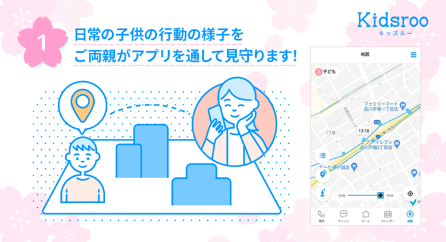 Kidsrooアプリを搭載したスマホを子供が持って移動するだけで、ご両親のアプリ上でリアルタイムに子供の居場所が表示されます。学校の登下校、塾や習い事・部活、お友達と遊びに出かける様子など、子供の日々の行動の様子を見守ることができます。