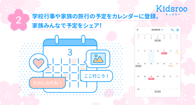 Kidsrooアプリには家族同士で予定を共有しあえるカレンダー機能があります。子供の学校の予定や家族で計画した旅行の予定などプライベートなスケジュールを家族だけで共有しあえます。