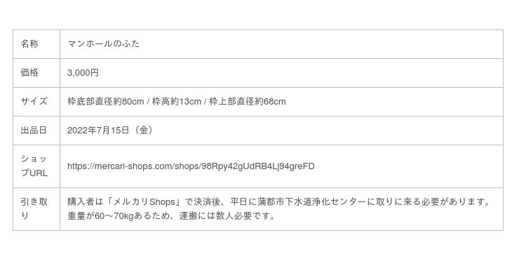 株式会社ソウゾウ(以下、ソウゾウ)の運用する、スマホ1つで誰でも簡単にネットショップを開設できるEコマースプラットフォーム「メルカリShops」を活用し、愛知県蒲郡市が7月15日より蒲郡市内で利用されていたマンホールの“ふた”を出品いたします。