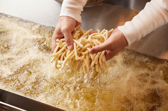 - コラボレーションの経緯 2022年2月に開催されたコンテストにて、岐阜大学社会システム経営学環の2名の学生から、丸亀製麺の食品ロス削減を目的として規格外となったうどんを使った商品企画の提案がありました。過去に当社が試作した結果も踏まえ、当時の課題点も克服する提案により、実現可能性が高いと判断。製麺にもこだわり抜いた丸亀製麺のうどんを1本でも多く大切にしたいという想いから、コンテスト終了後の2023年2月頃より学生と丸亀製麺で実現化に向けた企画をスタート。提案いただいた調理方法を実際の店舗オペレーションに落とし込んだ際の課題解決や、食感や揚げ時間、調理プロセスの検討、うどんと相性の良い味付けの選択など試作を繰り返し、その度に試食会も行われました。こうして、提案から1年以上の月日をかけ、「丸亀シャカシャカ揚げうどん」が誕生しました。