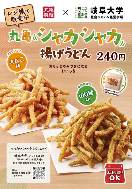 - 「丸亀シャカシャカ揚げうどん」について 「丸亀シャカシャカ揚げうどん」はきなこ味、のり塩味があり、フレーバーをお客さまにシェイクいただくことで、全体に味が渡りながら一層の風味を感じていただけます。お店に貼っているポップ等も、岐阜大学の学生のお二人と協働でデザイン。ご家族やご友人とシェアしながら楽しんで欲しいという明るいメッセージを込めました。シャカシャカ振って、カリっとやみつきになるおいしさを、是非お楽しみください。【商品概要】商品名:丸亀シャカシャカ揚げうどん価格:240円(税込)販売店舗:丸亀製麺岐阜東店、丸亀製麺さいたま桜店販売期間:2月27日(火)~4月29日(月)