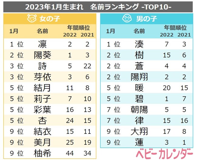 専門家から直接アドバイスを受けられる日本最大※の育児支援サイトを運営する株式会社ベビーカレンダー(旧社名:株式会社クックパッドベビー、本社:東京都渋谷区、代表取締役:安田啓司、以下「ベビーカレンダー」)は、赤ちゃんの名前ランキングを毎月調査・発表しています。11 月 1 日には、2022 年に生まれたお子さん107,289 名を対象に調査した『2022 年赤ちゃんの名前ランキング』を発表しました。