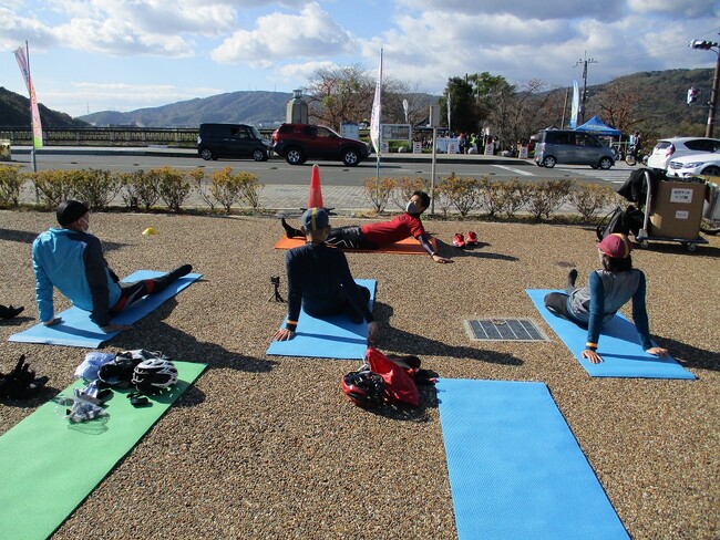 さくらであい館前広場では、サイクリスト向けストレッチ体験とマルシェも開催。
