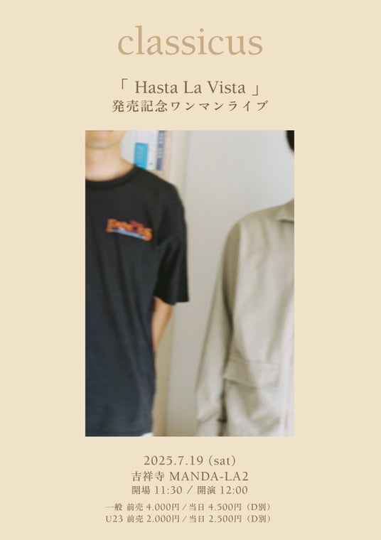ex.andymori、現在は銀杏BOYZをはじめ、数々のアーティストのサポートドラマーとしても活動しているシンガーソングライター・岡山健二と、昔からの音楽仲間であり、現在は大分県杵築(きつき)市のカフェ・まめのもんや店主兼焙煎士の村上淳也による、三重県伊賀市出身の2人組バンドclassicusが、2025年7月23日に結成10年の節目となるアルバム『Hasta La Vista』(ヨミ:アスタ・ラ・ビスタ)をリリースすることを発表した。