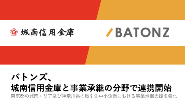 M&A総合支援プラットフォーム「BATONZ(バトンズ)」を運営する株式会社バトンズ(本社:東京都中央区、代表取締役:神瀬 悠一、以下バトンズ)は、城南信用金庫(本社:東京都品川区、理事長:川本 恭治)と中小企業における第三者承継・M&Aを支援するための連携を開始したことをお知らせします。