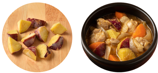 今まではかたくて火の通りに時間がかかるため使用していなかったさつま芋も、今回新たにカット食材として仲間入り。カット済みの利点を活かし、そのままフライパンに入れて調理OK!食べ応えのある乱切りで彩りを残すため皮付きにしました。