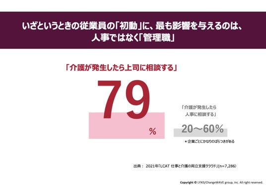 さらに当社の調べでは、いざ介護が始まるとなった場合の職場での相談先として、従業員の79%が「まず上司に相談する」という結果が出ています。