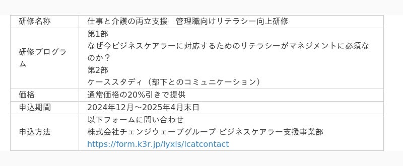 当社ではこれまでも、管理職の立場・役割・悩みを熟知した講師による、管理職のための「仕事と介護の両立」に関するリテラシー向上研修を実施してきました。今月22日で、改正育児・介護休業法の施行まであと100日となるため、企業の早急な対策検討を後押しするよう、通常価格より20%引きで導入しやすいキャンペーンを実施します。