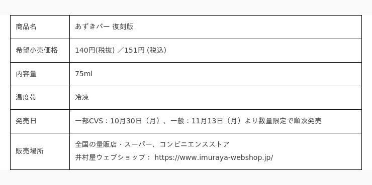 井村屋株式会社(本社:三重県津市高茶屋七丁目1番1号、社長:岩本 康)は、代表商品である『あずきバー』が発売50周年を迎えたことを記念して、1973年発売時の味わいとパッケージデザインを再現した『あずきバー 復刻版』を、一部CVS:10月30日(月)、一般:11月13日(月)より数量限定で順次発売します。