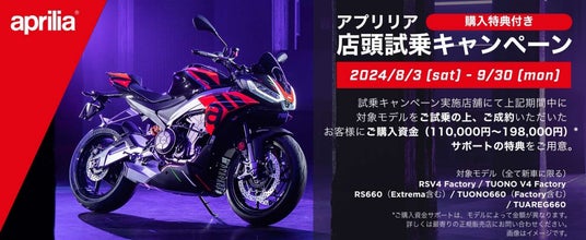 ピアッジオグループジャパン株式会社 (本社:東京都港区芝 2 丁目、代表取締役 ネリ・ミクラウス)は、スポ ーティーでスタイリッシュなデザインと、ビギナーからベテランライダーまでもが虜になる本物志向の走りと楽しさ が魅力のアプリリアのスポーツバイクを、お近くの正規販売店でご体感いただける特典付き試乗キャンペーン を、2024 年 8 月 3 日(土)から 9 月 30 日(月)まで、キャンペーン対象店舗にて実施いたします。 当キャンペーンでは、アプリリアをご試乗いただいた方で、実施期間中にご試乗した店舗にて試乗したモデル の新車をご成約された方全員に、購入サポート金として 110,000 円~198,000 円※をプレゼントする特典をご用 意し、新たなスポーツバイクライフのスタートを応援いたします。 (※サポート金額はモデルにより異なります)