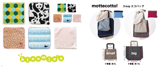 桜と猫のモチーフを組み合わせた抗菌防臭加工の限定商品や、新学期を前に、子供にも人気のふかふか無撚糸を使った動物柄のミニタオル、さらに大小二つのサイズを合体させた3wayエコバッグなど、バラエティに富んだラインナップです。お世話になったあの人へ、プレゼントにもおすすめです。