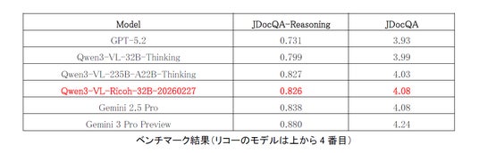 株式会社リコー(社長執行役員:大山 晃)は、経済産業省と国立研究開発法人新エネルギー・産業技術総合開発機構(NEDO)が実施する、国内における生成AIの開発力強化を目的としたプロジェクト「GENIAC(Generative AI Accelerator Challenge)*1」第3期において、図表を含む多様なドキュメントを、高精度に読み取ることができる、リーズニング性能*2を備えたマルチモーダル大規模言語モデル(以下、リーズニングLMM)の基本モデル「Qwen3-VL-Ricoh-32B-20260227」の開発を完了したことをお知らせします。本モデルは、多段推論を通じて複雑なドキュメントを理解できる点が特徴です。