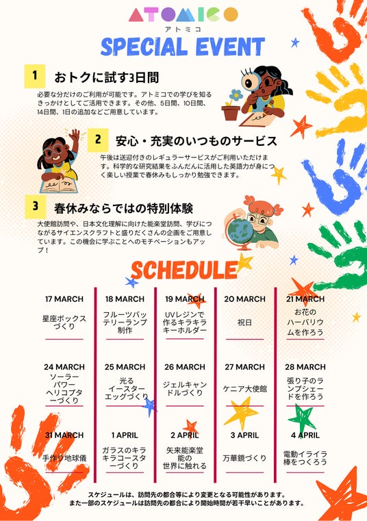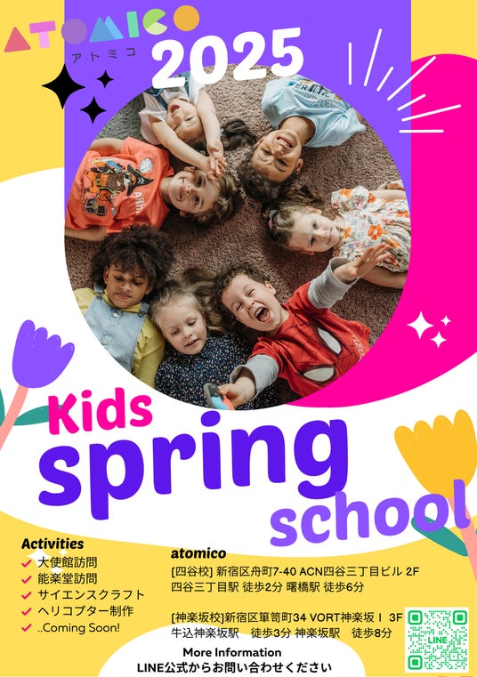 スパトレ株式会社(本社:東京都千代田区、代表取締役:向井麻里絵)は学童保育型英語スクール「atomico」にてスプリングスクールを3/17~4/4に開催いたします。レギュラー授業に加え、大使館訪問、能楽堂訪問、ヘリコプター制作、サイエンスクラフトなど様々な特別プログラムをご用意しております。