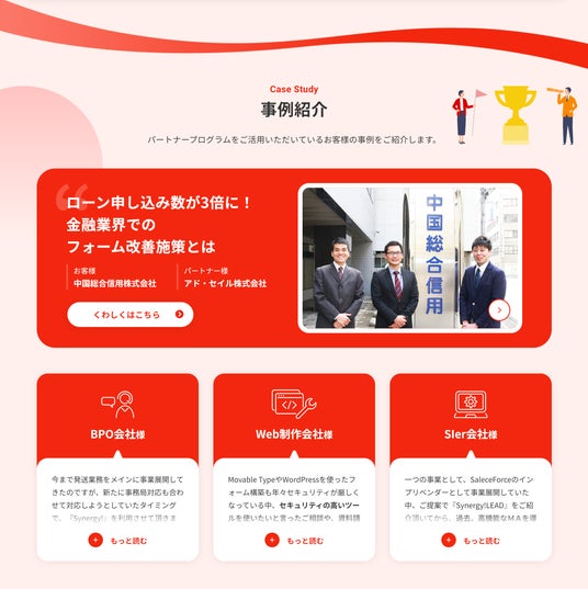 パートナープログラムを活用いただき、お客様、パートナー様、双方にご満足いただいているデジタルマーケティング会社様、Web制作会社様、システム開発会社様、BPO事業会社様など、さまざまな業態のパートナー様の声を紹介しています。