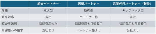 また今回の刷新に合わせてすべてのパートナープログラムにおいて、サポートの充実も図りました。例えばパートナー様がお客様にご案内いただく際の提案資料の作成サポートや、ご提案時の営業同行をさせていただくことで、よりパートナー様が営業しやすい環境を整えました。事業戦略に応じて3つのパートナー形態よりお選びください。