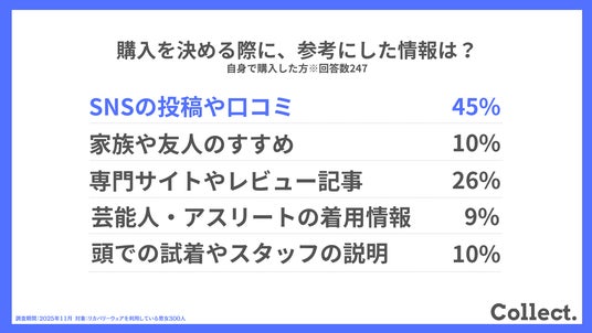 購入時に参考にした情報は、「SNSの投稿や口コミ(45%)」が最多で、「専門サイトやレビュー記事(26%)」がそれに続きました。「家族や友人のすすめ(10%)」「芸能人・アスリートの着用情報(9%)」「店頭での試着やスタッフの説明(10%)」も一定の影響力があります。消費者は、第三者のリアルな体験談や評価を重視していることがわかります。