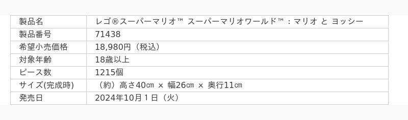 ン)は、任天堂株式会社(以下任天堂)の人気キャラクター、スーパーマリオ(TM)とレゴグループのコラボレーション製品である「レゴ(R)スーパーマリオ(TM)」シリーズより、大人向け製品として新たに「レゴ(R)スーパーマリオ(TM) スーパーマリオワールド(TM):マリオ と ヨッシー」を2024年10月1日(火)より販売します。