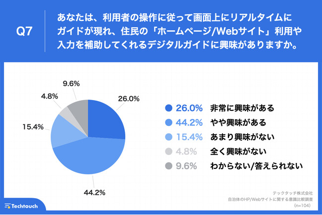 自治体のWeb担当者(n=104)に、「Q7.あなたは、利用者の操作に従って画面上にリアルタイムにガイドが現れ、住民の「ホームページ/Webサイト」利用や入力を補助してくれるデジタルガイドに興味がありますか。」と質問したところ、「非常に興味がある」が26.0%、「やや興味がある」が44.2%という回答となりました。