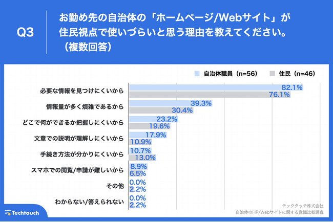 Q1で「非常に使いづらい」「やや使いづらい」と回答した方に、「Q3.お勤め先の自治体の「ホームページ/Webサイト」が住民視点で使いづらいと思う理由を教えてください。(複数回答)」と質問したところ、自治体のWeb担当者は「必要な情報を見つけにくいから」が82.1%、「情報量が多く煩雑であるから」が39.3%、「どこで何ができるか把握しにくいから」が23.2%、住民は「必要な情報を見つけにくいから」が76.1%、「情報量が多く煩雑であるから」が30.4%、「どこで何ができるか把握しにくいから」が19.6%という回答となりました。