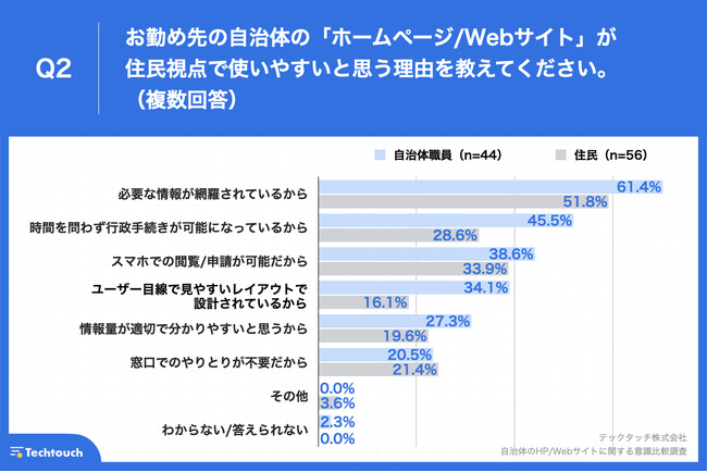 Q1で「非常に使いやすい」「やや使いやすい」と回答した方に、「Q2.お勤め先の自治体の「ホームページ/Webサイト」が住民視点で使いやすいと思う理由を教えてください。(複数回答)」と質問したところ、自治体のWeb担当者は「必要な情報が網羅されているから」が61.4%、「時間を問わず行政手続きが可能になっているから」が45.5%、「スマホでの閲覧/申請が可能だから」が38.6%、住民は「必要な情報が網羅されているから」が51.8%、「スマホでの閲覧/申請が可能だから」が33.9%、「時間を問わず行政手続きが可能になっているから」が28.6%という回答となりました。