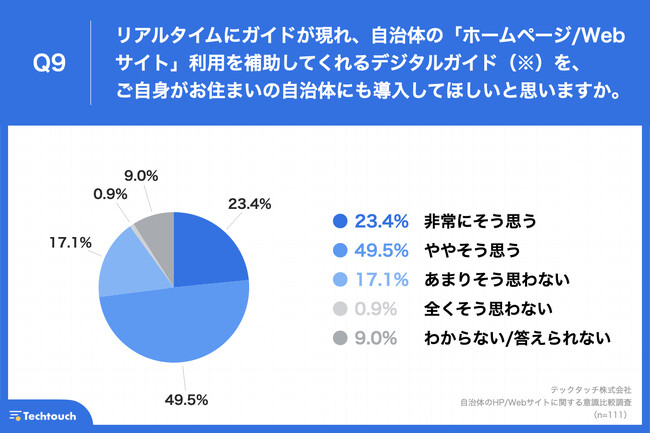 住民(n=111)に、「Q9.あなたは、自身の操作に従ってリアルタイムにガイドが現れ、自治体の『ホームページ/Webサイト』利用を補助してくれるデジタルガイドを、ご自身がお住まいの自治体にも導入してほしいと思いますか。」と質問したところ、「非常にそう思う」が23.4%、「ややそう思う」が49.5%という回答となりました。