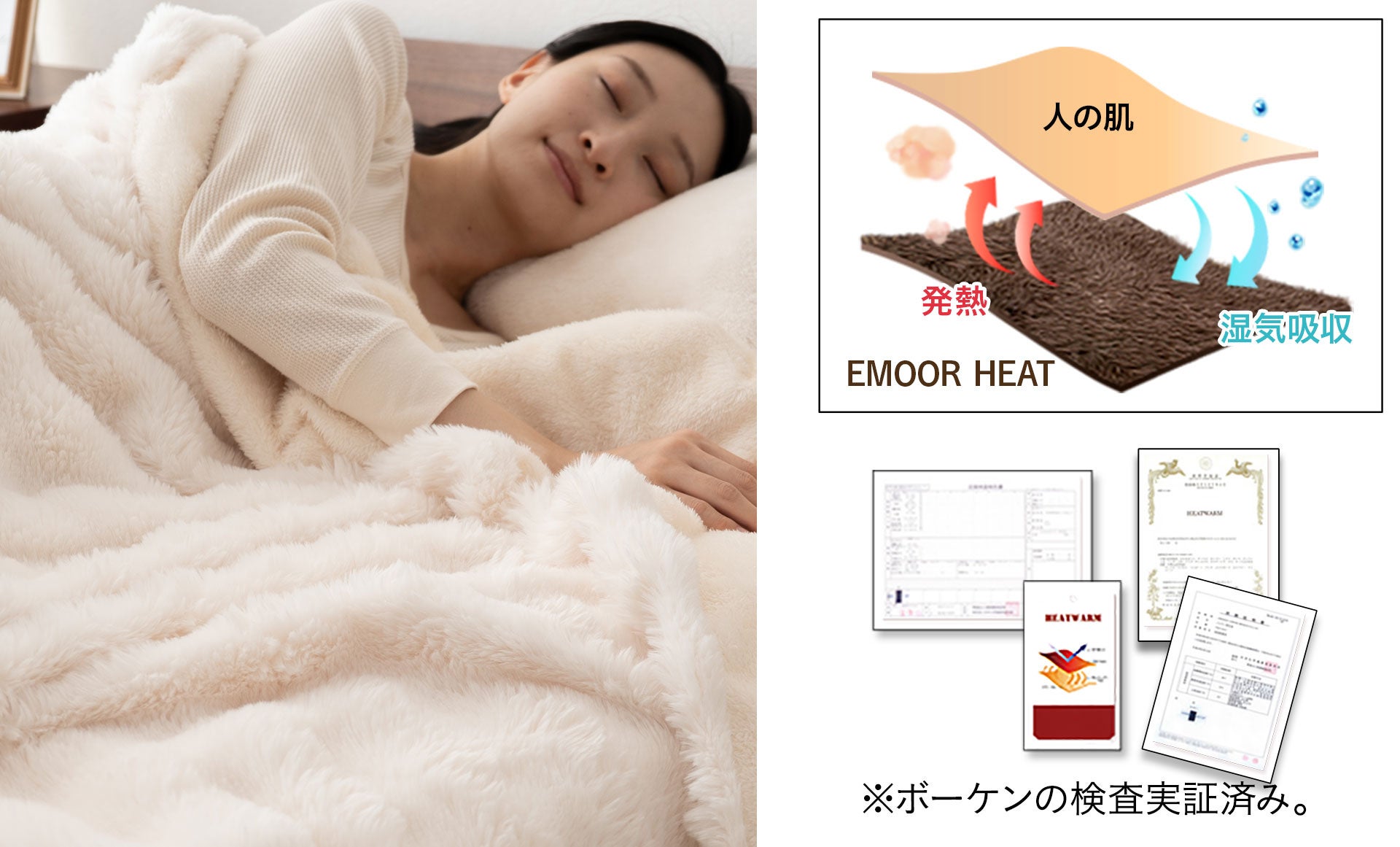 エムールヒートは人から出る蒸気や汗を吸収し熱に変える働きをします。人は一夜でコップ2杯分の寝汗をかくので発熱のエネルギー源が消えることなく、暖かさが持続します。さらに、ボーケン抗ピリング効果(毛玉のできにくさ)検査済で長くお使いいただけます。