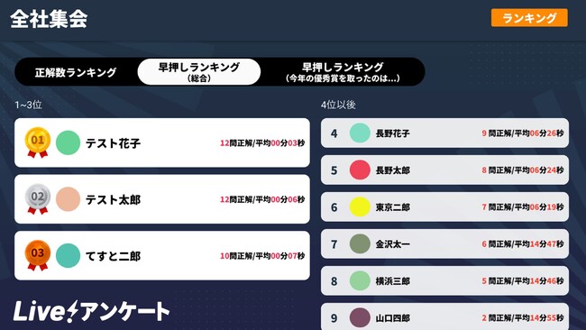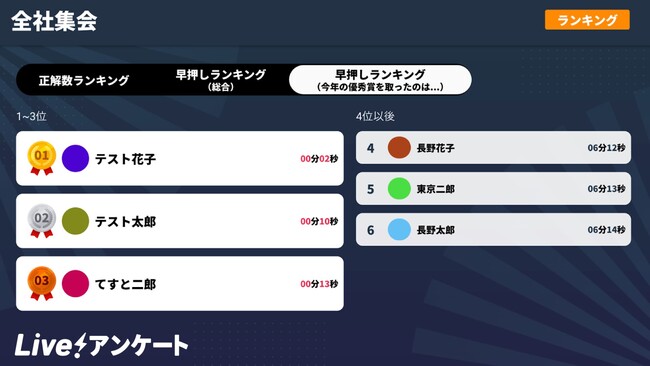 その中で、Live!アンケート内の「Live!クイズ」におきまして、兼ねてからご要望をいただいておりました「早押しランキング」機能を今回追加いたしました。
