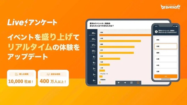 Live!アンケートは2019年7月のリリースから3年が経過し、オンラインイベント・リアルイベントの形式を問わず多くのシーンでのリアルタイム投票やリアルタイムアンケートでイベントの付加価値を高め、リリースから3年で10,000社への導入、400万人のユーザー体験を実現しております。