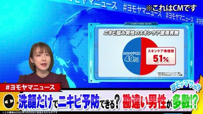 「uno(ウーノ)」では、男性の大人肌のニキビ防止がこれひとつでできるオールインワンジェル「ウーノ アクネケア パーフェクションジェル(医薬部外品)」の発売にあわせて、「洗顔だけでニキビ予防ができると思っている男性が、”よもやまさか”2人に1人いる」というニュースを紹介。ターゲットである10~30代のニキビ予防に関する意識調査や肌悩みのランキングデータを紹介することで、ニキビ予防ケアの見直しを啓発し「uno(ウーノ)」の商品特長について訴求しました。本番組の視聴者は半数近くが「uno(ウーノ)」のターゲット層である男性で、コーナーで紹介した内容に対し「ウーノ使ってるよ」「unoは何だかんだ迷ったら買うな」という好意的なコメントや、「洗顔しかしてない」「ウーノさんなら予防できるってわけか」などの理解促進に繋がるコメントも寄せられました。