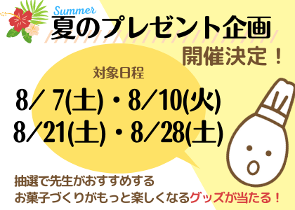 8月のオープンキャンパスに参加された方から抽選で『本校講師おすすめ!もっとお菓子つくりが楽しくなるグッズ』が当たります