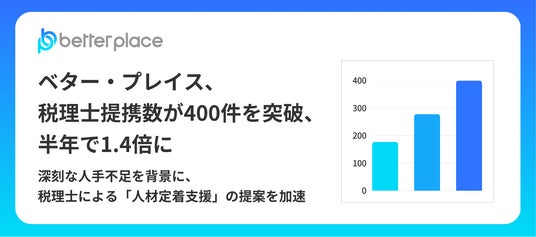 「福祉はぐくみ企業年金基金」(以下、「はぐくみ企業年金」)を中心に、企業年金・退職金制度の導入・設計をサポートする株式会社ベター・プレイス(本社:東京都新宿区、代表取締役社長CEO:森本 新士、https://bpcom.jp/ 、以下、ベター・プレイス)は、税理士法人・税理士事務所との紹介提携数が累計400件を突破したことをお知らせします。2025年9月末に発表した「新規提携件数200件突破」から半年で120件超の増加、累計で1.4倍の増加となります。