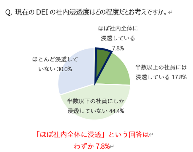 一方、上記で取り組んでいると回答した85.7%の企業に、DEIの社内浸透度について聞いてみると、「ほぼ社内全体に浸透している」という回答はわずか7.8%。「ほとんど浸透していない」(30.0%)、「半数以下の社員にしか浸透していない」(44.4%)という回答が全体の4分の3を占める結果となり、多くの企業が社員へのDEIの浸透度は十分ではないと考えていることがわかりました。
