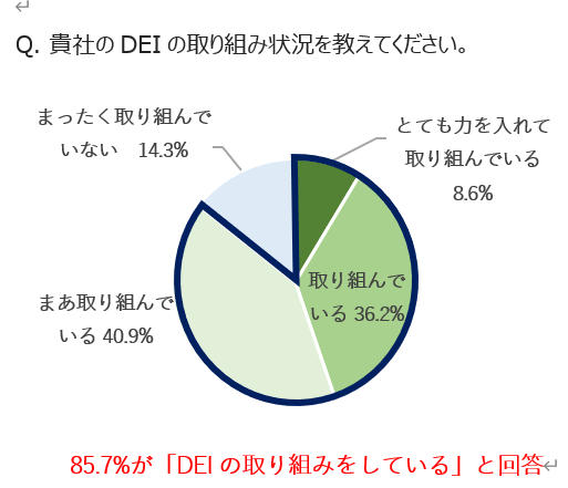 DEIの取り組み状況について聞いてみると、「とても力を入れて取り組んでいる」(8.6%)、「取り組んでいる」(36.2%)、「まあ取り組んでいる」(40.9%)となり、85.7%の企業がDEIの取り組みを行っていることがわかりました。