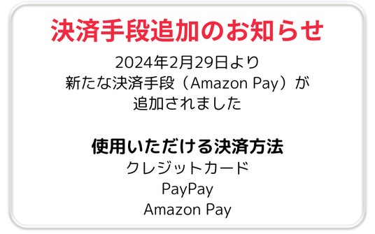決済手段(Amazon Pay)追加お客様の利便性の向上を目的として、既に対応している決済手段のクレジットカード・PayPayに加えて、新たにAmazon Payが使用できるようになりました。