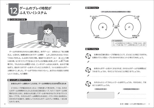 ゲームがしたいのにお母さんにゲーム機を隠されてしまった例など、子どもの日常のトラブルをシステムでとらえるワークを24例掲載〈P.50~51ページより〉