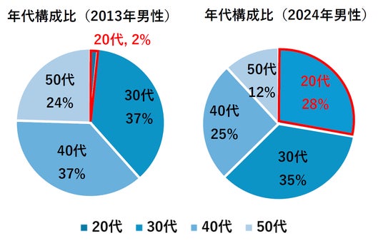 過去10年間、男性利用者数が増加する中、特に20代のお客様の割合が顕著に増加していることがわかりました。2013年には20代の利用者は全体のわずか2%、約1,900人程度でしたが、2024年にはその割合が20%を超え、利用者数は23万人以上と、約123倍に拡大しました。このデータは、過去10年間で20代の美容意識が大きく変化し、向上していることを示しています。