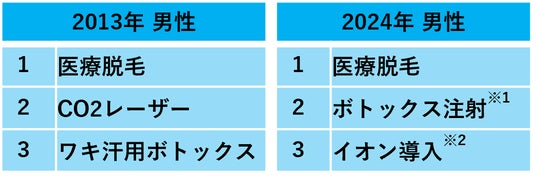 さらに、男性の選ぶ治療内容にも変化が見られます。10年前は医療脱毛が治療件数の過半数を占めていましたが、2024年にはボトックスやイオン導入といった美肌治療の割合が増加傾向にあります。