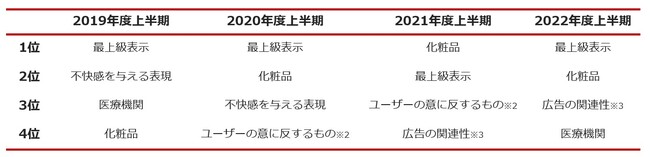 ~ 非承認理由は「最上級表示、No.1表示」や「薬用化粧品・化粧品」が常に上位、2022年度上半期は「医療機関」が増加 ~